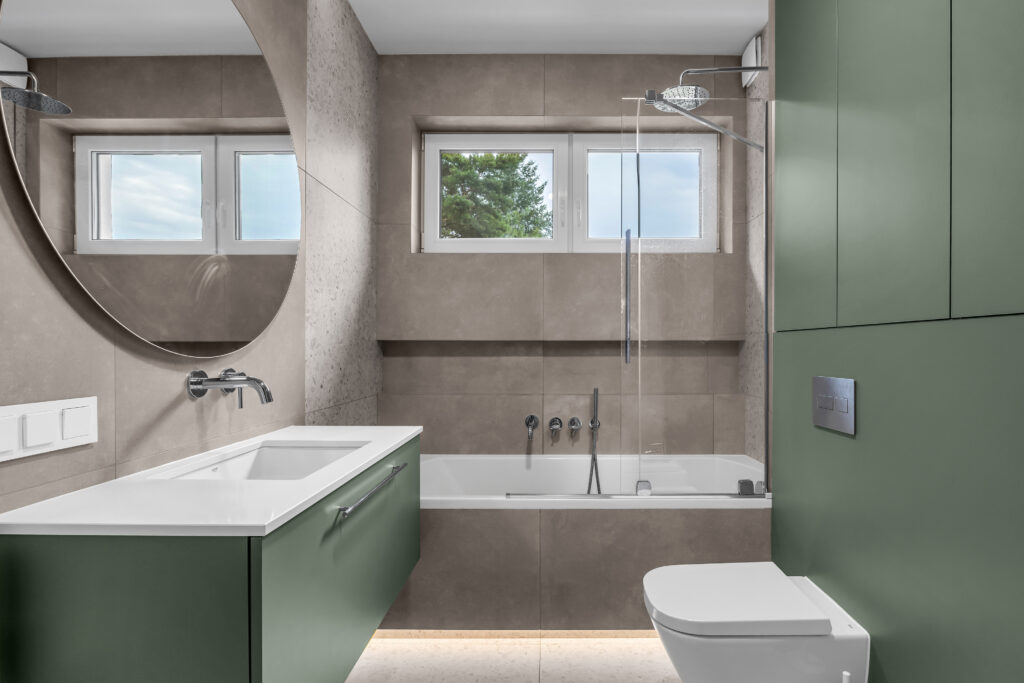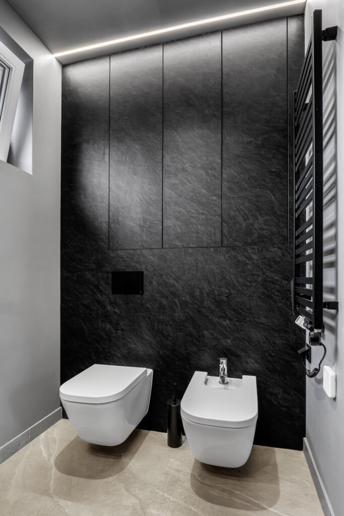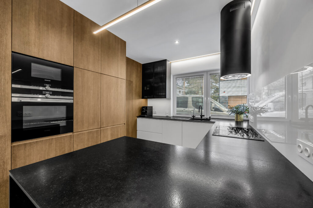 Realizacja ukazuje nowoczesny minimalizm, podkreślony przez wyważoną paletę barw – od chłodnych szarości i grafitów, przez głębokie odcienie zieleni i granatu, po naturalne drewno i jasne, neutralne tło. Przemyślane połączenie tekstur – matowych frontów meblowych, surowych kamieni i miękkich tkanin – tworzy elegancką, a zarazem przytulną atmosferę.