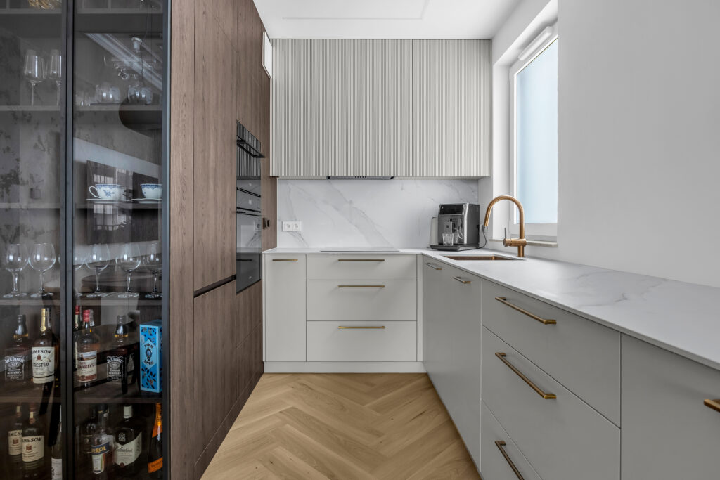 Sercem realizacji jest kuchnia na wymiar, w której połączono drewniane fronty z frontami lakierowanymi. Górne szafki zostały wykonane z dekoracyjnym ryflowaniem, które nadaje zabudowie lekkości i wyjątkowego charakteru.