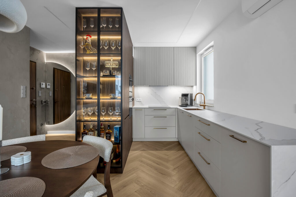 W kuchni zaprojektowano również witrynkę na wymiar z podświetleniem LED, która efektownie eksponuje zawartość i wprowadza nastrojowe światło. Zabudowa została w pełni dopasowana do przestrzeni, zapewniając ergonomię oraz dużą ilość miejsca do przechowywania.