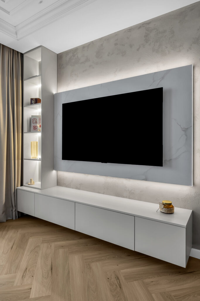 W salonie wykonano nowoczesną zabudowę RTV na wymiar z lakierowanymi frontami. Całość uzupełnia witrynka z oświetleniem LED, która pełni funkcję zarówno dekoracyjną, jak i praktyczną. Podświetlenia LED podkreślają formę mebla i budują elegancką atmosferę w strefie dziennej.