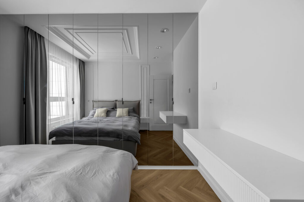 Sypialnia na wymiar – szafa na całą ścianę z lustrzanymi frontami i toaletka